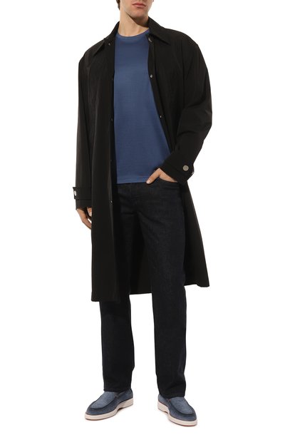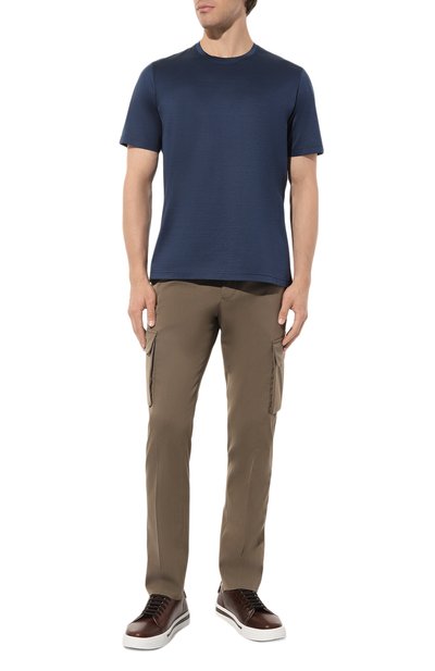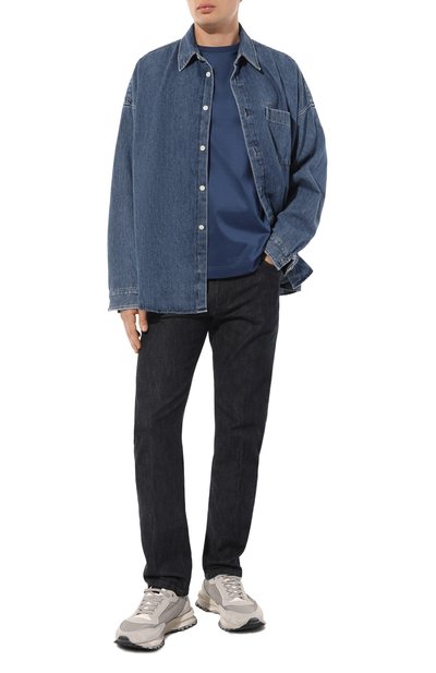 Темно-синюю футболку прямого силуэта выполнили из нежного хлопка, который хорошо пропускает воздух и отводит влагу, поэтому в ней будет комфортно в течение всего дня. Текстиль из длинноволокнистого хлопка премиальных сортов на ощупь напоминает шелк, а изделие из него не пилингуется и не деформируется после стирки.