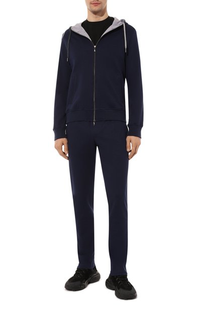 Прямые брюки из прочного трикотажа темно-синего цвета подойдут для прогулки в переменчивую погоду. Тонкий лиоцелл в основе текстиля обладает антибактериальными свойствами, а мягкие волокна шерсти поддерживают необходимую терморегуляцию. Широкий пояс-кулиска со шнуром позволяет обойтись без ремня.