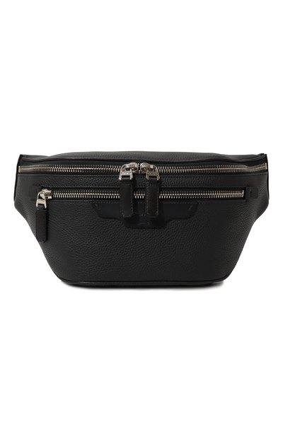 При создании темно-синей поясной сумки дизайнеры сыграли на контрасте фактур. Аксессуар из плотной зерненой кожи дополнили пуллерами и фигурной нашивкой из такого же, но гладкого материала с фирменной сложносочиненной патиной. Роль сияющего акцента взяли на себя крупные металлические молн ии и фастекс, позволяющий регулировать длину текстильного ремня. Внутрь изделия поместятся портмоне, ключи и смартфон.