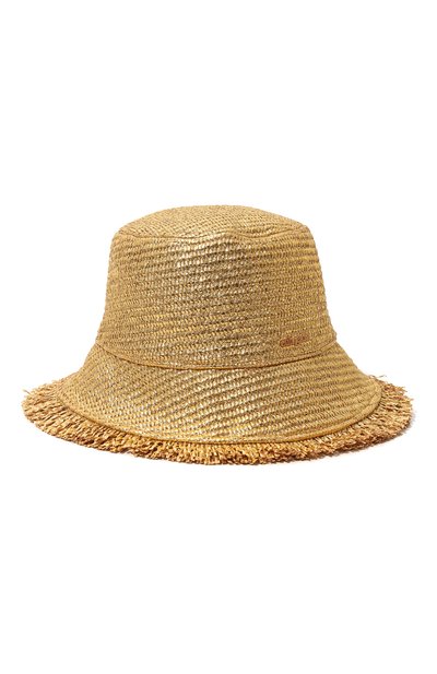 Эта золотистая широкополая панама добавит летнему наряду яркий блеск. Для изготовления модели с высокой тульей, декорированной логотипом, использовали металлизированную рафию, мерцающую в лучах солнца. Края аксессуара, который хорошо пропускает воздух, подчеркнули густой короткой бахромой.