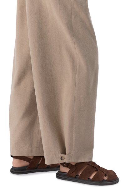 Джузеппе Сантони выбрал для создания легких сандалий на плоской подошве мягкую бархатистую замшу, фактура которой добавляет оттенку горького шоколада глубину. Модель с двумя широкими перемычками дополнили узким регулируемым ремешком, застегивающимся золотистой квадратной пряжкой сбоку.