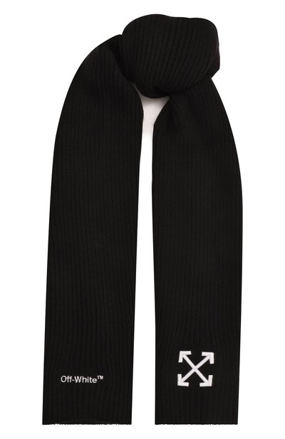 Черный шарф мастера марки связали из мягкой нежной шерсти. Принадлежность бренду подчеркнули контрастным логотипом и знаковыми перекрещенными стрелками. Длины аксессуара хватит, чтобы сделать несколько раз обернуть вокруг шеи или сформировать французский узел.