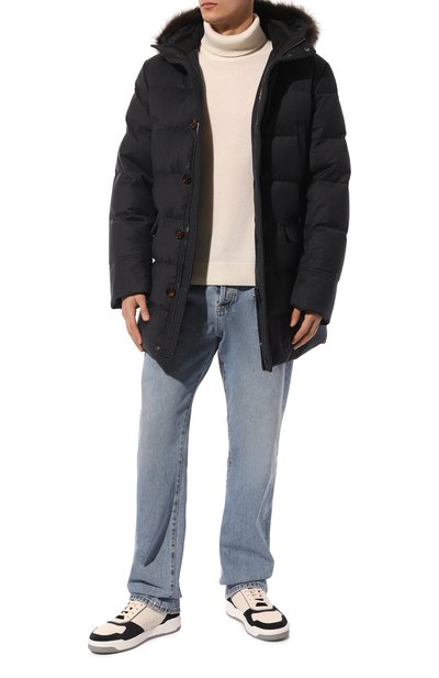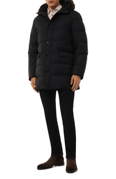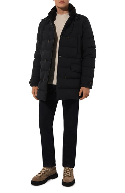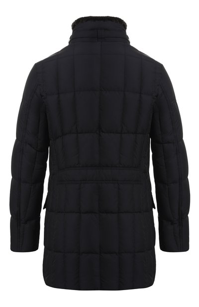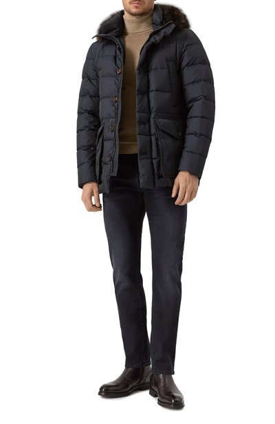 Плотный водоотталкивающий текстиль и легкий, но при этом теплый наполнитель превращают темно-синий пуховик в идеальный вариант для переменчивой погоды межсезонья. За дополнительную защиту от ветра и холода отвечают отстегивающийся капюшон, воротник-стойка со съемной меховой отделкой и штормовая пуговичная планка, закрывающая молнию.