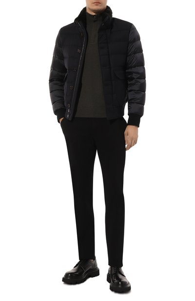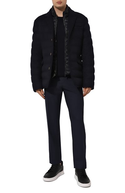 Для пошива темно-синей куртки, крой которой позаимствовали у однобортного пиджака, мастера марки использовали мягкую шерстяную фланель. Модель дополнили съемной вставкой в тон, имитирующей надетый под низ стеганый жилет с воротником-стойкой. Изделие утеплили легким наполнителем, который не утяжеляет вещь.