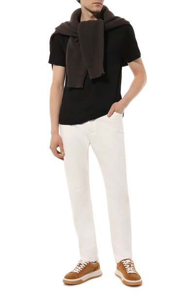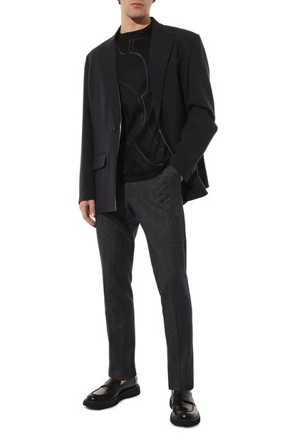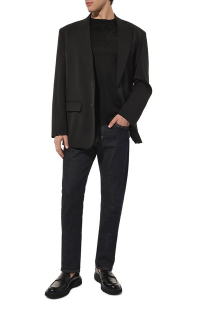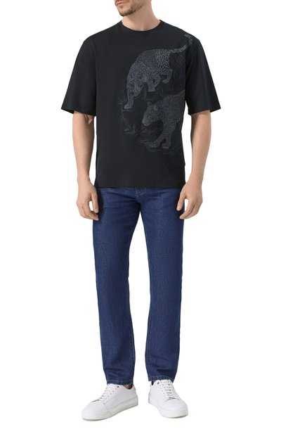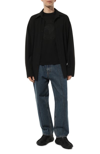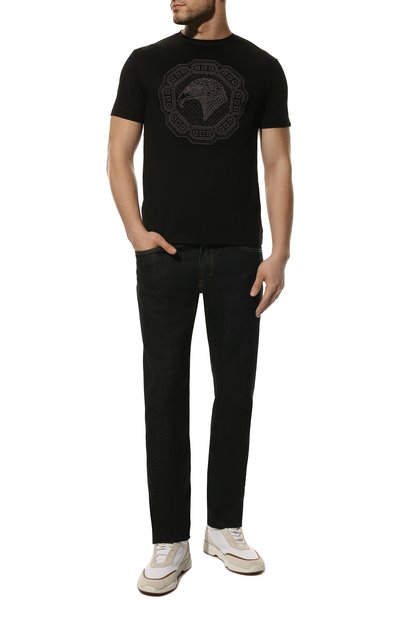 Футболку украсили узором в виде знаковой эмблемы Royal Eagle: мотив вышили так, чтобы он напоминал зарисовку, сделанную от руки карандашом. Для изготовления модели использовали тонкое джерси, в составе которого соединили модал и хлопок.