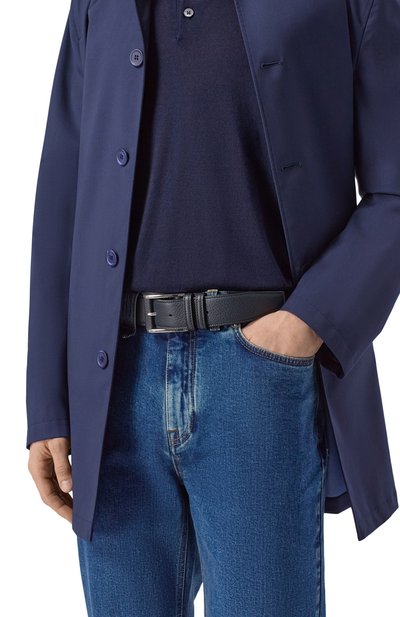 Ремень из зернистой телячьей кожи дополнит и классические брюки, и джинсы. Аксессуар регулируется квадратной пряжкой и тренчиком с фацетным кантом, перфорированным узором и выгравированным логотипом.