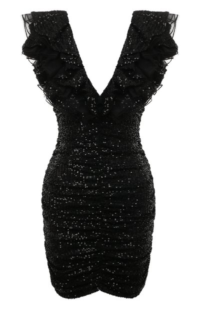 Черное облегающее мини-платье буквально создано, чтобы сиять на вечеринке. Модель выполнили из шелковистого эластичного текстиля, полностью расшитого сверкающими пайетками, каждая из которых усиливает блеск соседней. Мягкая драпировка визуально корректирует силуэт, а многоярусные пышные оборки очерчивают V-образный вырез спереди и сзади.