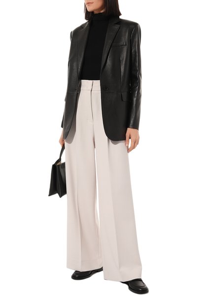 Для пошива свободных кремовых брюк Доротея Шумахер выбрала тонкую ткань на основе отборной шерсти с добавлением стрейчевых нитей и прочного шелковистого полиэстера. Приятный на ощупь материал почти не мнется, поэтому изделие с отглаженными стрелками будет долго выглядеть безупречно. Модель с крупной центральной шлевкой сзади удачно дополнит и повседневный образ с трикотажем, и наряд для офиса.