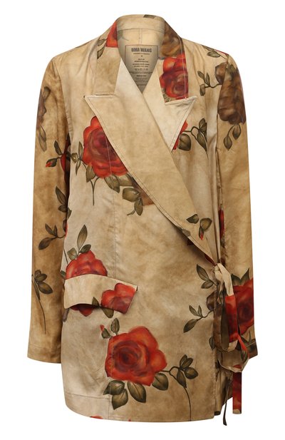 Для пошива светло-бежевого пиджака с широкими лацканами Ума Ванг выбрала легкий текстиль с ярким узором в виде крупных алых роз. Материал на основе нежной дышащей вискозы почти не мнется, поэтому изделие из него выглядит идеально в течение дня. Модель прямого кроя, с запахом комфортно садится по фигуре и не сковывает движения.