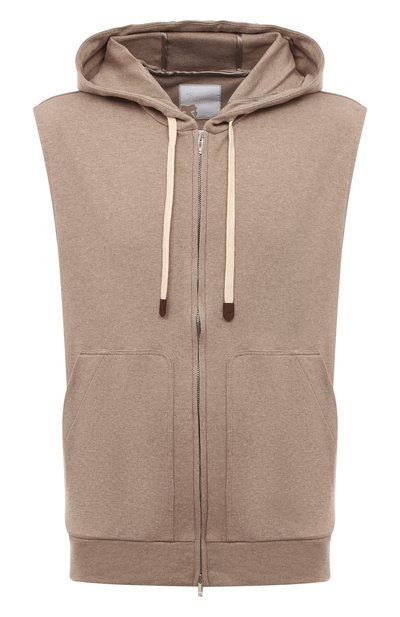 Для пошива бежевого жилета с крупными накладными карманами мастера марки использовали мягкий хлопковый трикотаж. Плотный материал сохраняет тепло при незначительном снижении температуры, поэтому в изделии будет комфортно в прохладные дни. Такая модель может сыграть роль промежуточного слоя в более холодную погоду.
