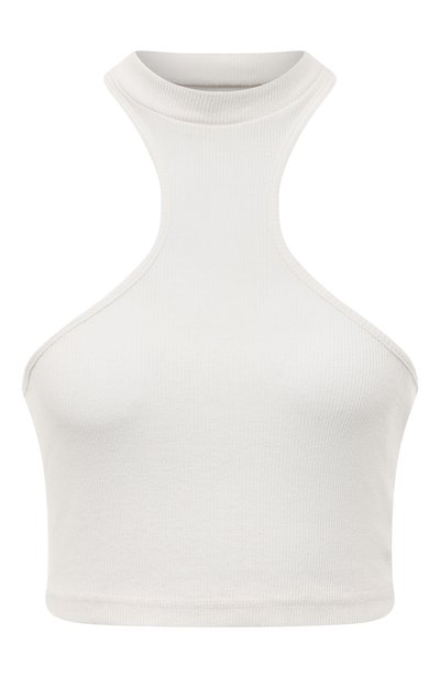 Белая укороченная майка выглядит так, словно при ее создании вдохновлялись спортивным бра. Иллюзию формируют утрированно глубокие проймы, которые придали переду и спинке Т-образную форму. Для пошива модели с небольшим воротом использовали рифленый трикотаж из премиального хлопка.