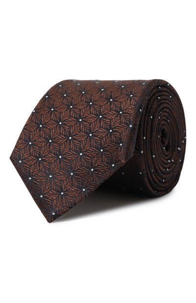 Для создания коричневого галстука использовали плотный шелк с характерным легким блеском, который придал крупному набивному узору визуальный эффект объема. Чтобы готовый аксессуар был пластичнее, а его края не загибались, мастера марки выверили линии трафаретом, тщательно их отутюжили и вручную выполнили скользящий шов.