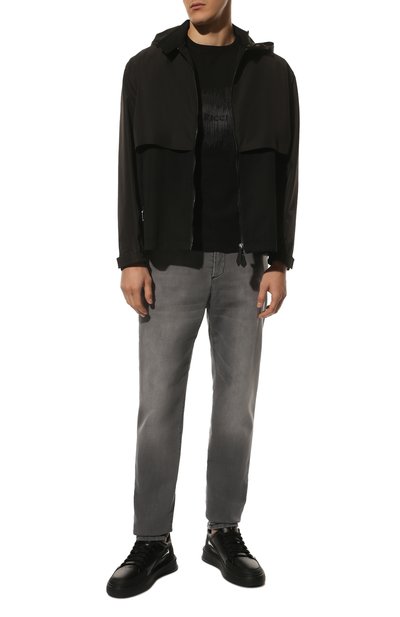Для изготовления черной футболки мастера марки, основанной Стефано Риччи, использовали мягкое джерси. В состав включили длинноволокнистый хлопок и шелковистый модал, поэтому материал хорошо пропускает воздух и почти не мнется. Спереди — прямоугольная нашивка в тон с изображением головы орла, окруженной паттерном из эмблемы бренда.