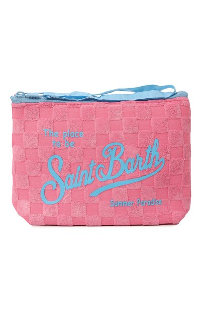 Мастера марки сшили косметичку оттенка клубничной пастилы из мягкого махрового текстиля с жаккардовым узором в шахматную клетку. Модель декорировали ярко-голубыми надписями и крупным логотипом. В тон им – молния сверху, пуллер которой дополнили короткой ручкой-петлей, чтобы изделие было удобнее носить.