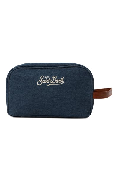 Для изготовления темно-синего несессера мастера марки использовали прочный деним. На передней панели контрастной белой нитью вышили небольшой логотип. Аксессуар, закрывающийся молнией, дополнили короткой кожаной ручкой, благодаря которой его удобнее носить в руке.
