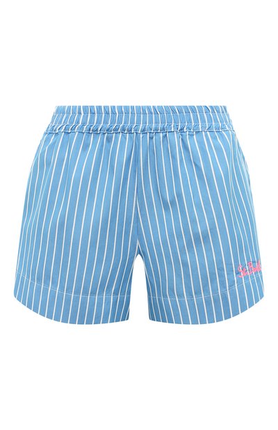 Ярко-голубые шорты в узкую белую полоску ненавязчиво сообщают о своем происхождении: слева снизу есть небольшой логотип, вышитый розовой нитью. Для создания изделия мастера бренда использовали шелковистую хлопковую ткань, которая пропускает воздух. Наши стилисты предлагают адаптировать свободную модель в пижамном стиле для города однотонными футболкой, кардиганом и сандалиями.
