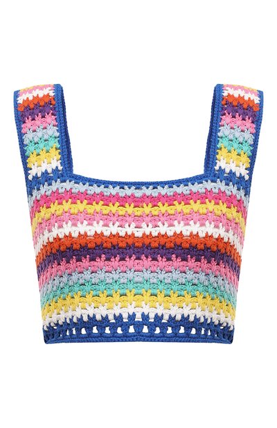Хлопковый топ, вручную выполненный в технике кроше, в яркости оставил позади радугу. Оттенки фуксии, розового и чистый белый дополняют привычное семицветье и складываются в жизнерадостную узкую полоску. Внизу рисунок становится ажурным, подчеркивая укороченный силуэт модели.