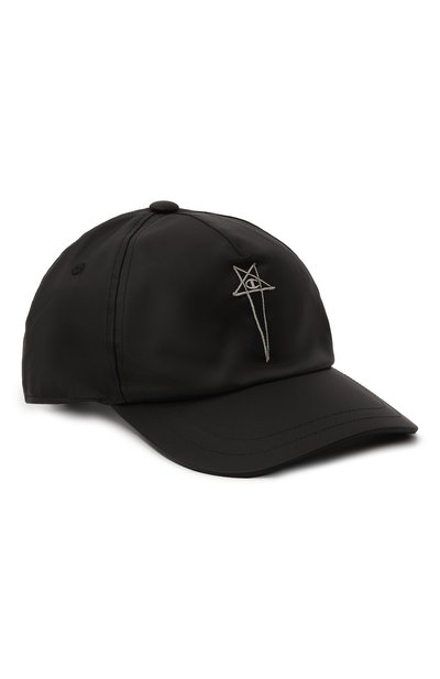 Черная бейсболка вошла в коллаборацию бренда с американской маркой спортивной одежды. Модель с прошитым изогнутым козырьком, регулируемым ремешком сзади и вентиляционными отверстиями выполнили из сертифицированного переработанного нейлона, что позволило сэкономить первичные ресурсы. Изделие декорировали вышитой фирменной пентаграммой и вписанным в нее элементом логотипа Сhampion.