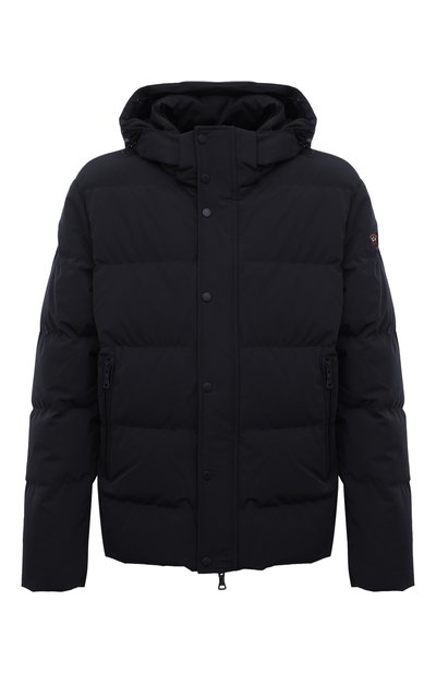 Для пошива черной стеганой куртки использовали прочный стрейчевый нейлон Typhoon RE 4X4. Мембранный материал с особенно плотным плетением нитей не промокает под проливным дождем, не пропускает ветер и не дает наполнителю из отборного гусиного пуха выбиваться наружу. Объемный регулируемый капюшон с высоким воротником-стойкой прикрывают голову и шею, поэтому можно отказаться от шапки и шарфа.