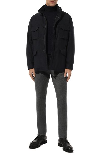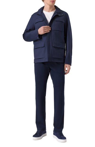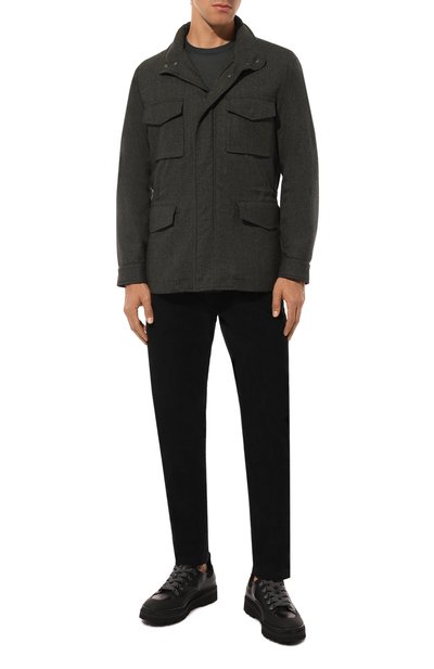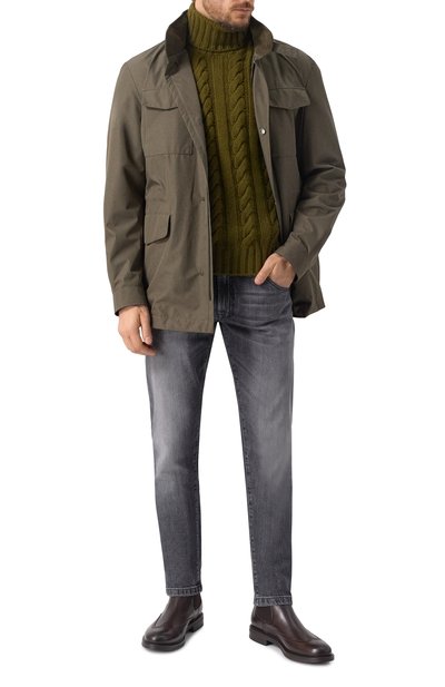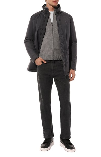 Серая куртка с глубоким капюшоном, скрытым в воротнике-стойке, выручит в переменчивую погоду. Для пошива модели с четырьмя карманами мастера марки использовали плотный непродуваемый полиэстер. Мягкий подклад выполнили из хлопка с добавлением кашемира. Изделие застегивается молнией, которую скрыли под широкой штормовой планкой.