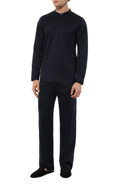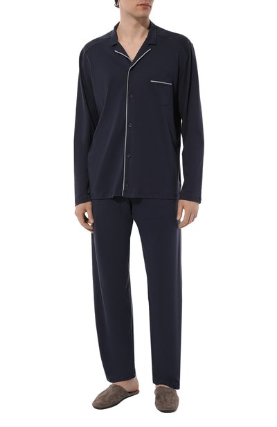 Темно-синюю пижаму сшили из мягкого дышащего сатина с деликатным блеском. Гладкий материал из премиального хлопка почти не ощущается на теле и хорошо пропускает воздух, обеспечивая безупречный комфорт во время сна и домашнего отдыха. Узкий белый кант по краям добавляет рубашке с длинными рукавами графичность. За удобную посадку брюк на талии отвечает широкий пояс с регулируемой кулиской.