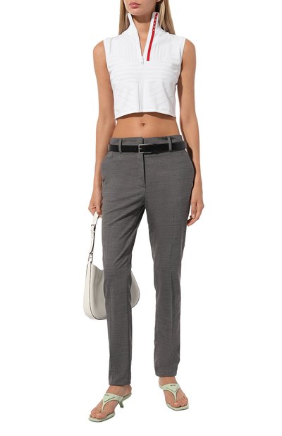 В крое серых брюк угадывается силуэт классических моделей со стрелками, однако изделие получилось комфортнее аналогов за счет широкого эластичного пояса, как у спортивных вещей. Для пошива мастера марки, основанной Брунелло Кучинелли, использовали тонкую плотную шерсть с добавлением нейлона и эластана. Шлевки украсили фирменными цепочками мониль.