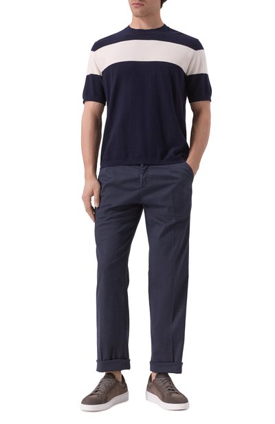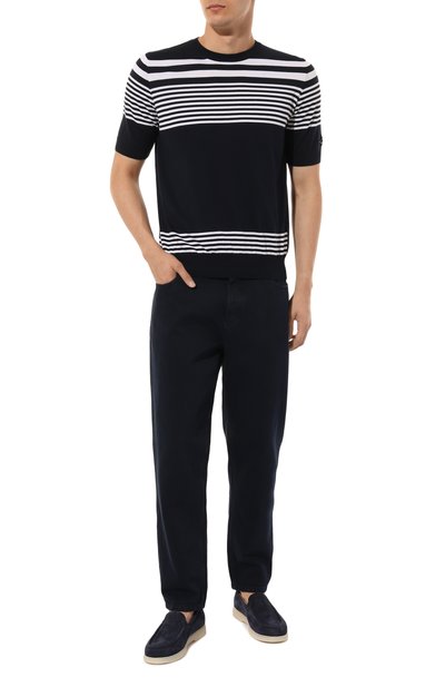 Темно-синий джемпер, украшенный белым полосатым узором, обеспечит комфорт в течение дня. Для изготовления модели с короткими рукавами мастера марки использовали приятный на ощупь хлопковый трикотаж, который не препятствует циркуляции воздуха, слегка тянется и мягко облегает силуэт.