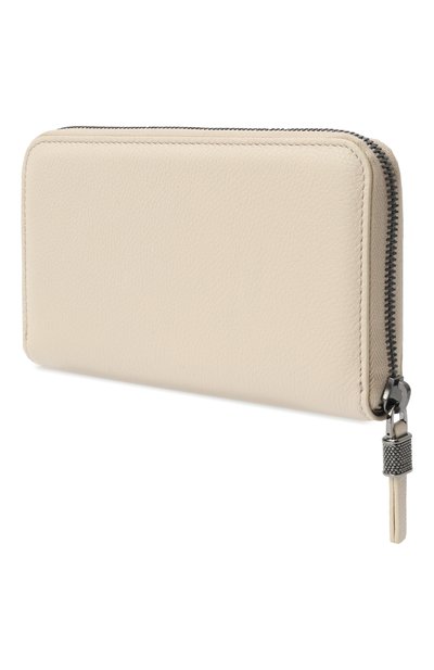 Для изготовления кошелька сдержанного кремового оттенка мастера марки использовали приятную на ощупь фактурную замшу. Внутри аксессуара предусмотрели 12 слотов для пластиковых карт, два отсека для банкнот и отделение для монет. Пуллер молнии, которой застегивается модель, декорировали рядами знаковых для бренда цепочек мониль.