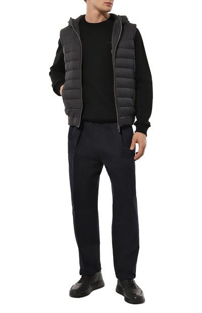 Для пошива серого жилета с воротником-стойкой и встречной молнией дизайнеры бренда, основанного Брунелло Кучинелли, выбрали тонкий мембранный нейлон. Такой материал не продувается ветром и отталкивает влагу. Роль утеплителя отдали почти невесомому пуху с добавлением пера, которые равномерно распределили по горизонтальным стеганым камерам.
