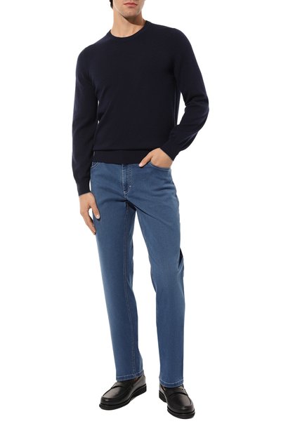 Команда марки приблизила базовые синие джинсы к джоггерам в комфорте, наделив деним эластичностью трикотажа. Отборный хлопок в нитях почти на треть заменили стрейчевыми волокнами, поэтому модель зауженного кроя дает полную свободу движений. Эксперименты с составом не только заставили материал тянуться, но и придали ему такую мягкость, будто изделие с замшевой полосой на заднем кармане носили долгие годы.
