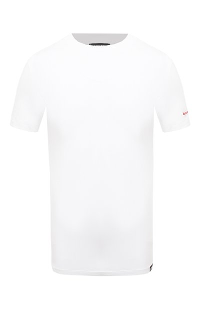 Облегающая белая футболка с круглым вырезом сшита из гладкого мерсеризованного хлопка. Его волокна намного прочнее обычных, а изделия из такого материала не растягиваются и не пилингуются со временем. Левый рукав однотонной легкой модели украшен красным логотипом марки.