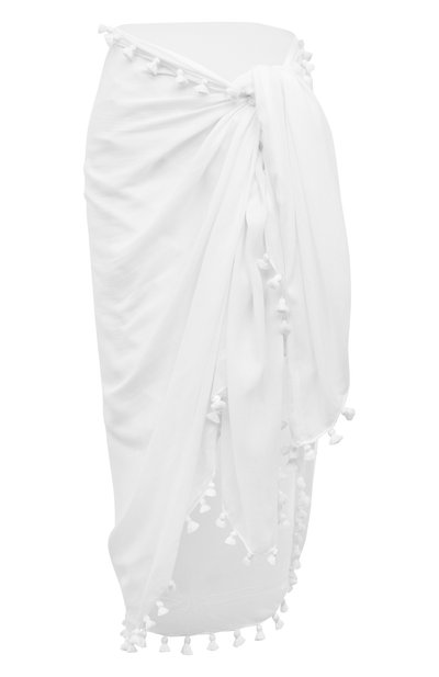 Для изготовления белого парео использовали необыкновенно тонкий, шелковистый на ощупь модал. Аксессуар из такого материала почти не ощущается на теле, быстро сохнет и при этом надолго сохраняет безупречный внешний вид. Края модели, завязывающейся на объемный узел, декорировали миниатюрными кисточками в тон.