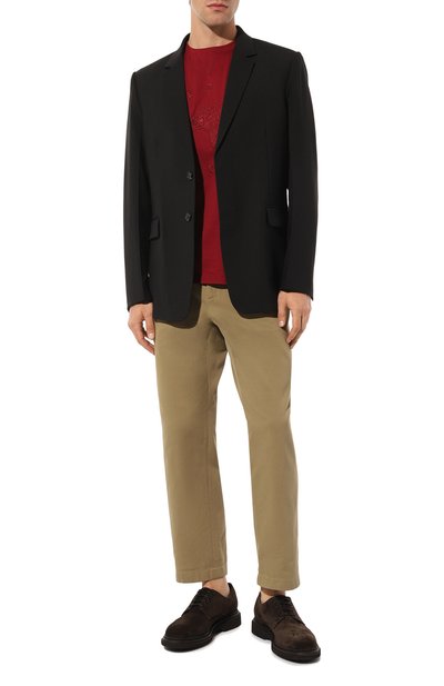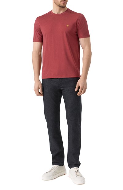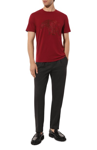 Красную футболку с короткими рукавами сшили из мягкого джерси. В дышащем материале соединили волокна премиального хлопка и шелковистой вискозы, поэтому модель исключительно приятно ощущается на коже и не вытягивается со временем. Роль декора отдали рельефной накладке в виде логотипа и головы орла, выполненных из оцинкованного металла.