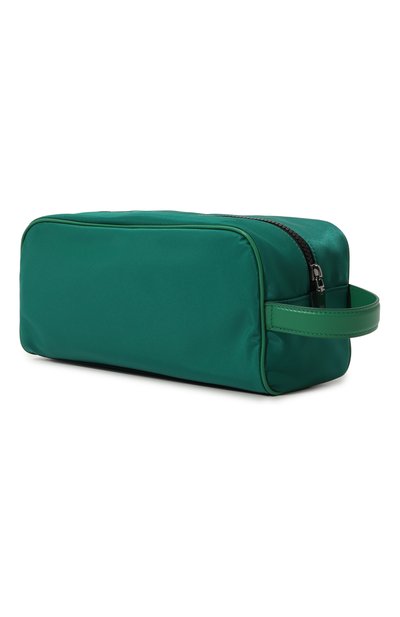 Несессер черного цвета громко заявляет о своем происхождении: на передней панели есть крупный контрастный принт в виде логотипа марки. Мастера бренда выполнили аксессуар из технической ткани с плотным переплетением нит ей. Для создания короткой боковой ручки выбрали прочную кожу в тон.