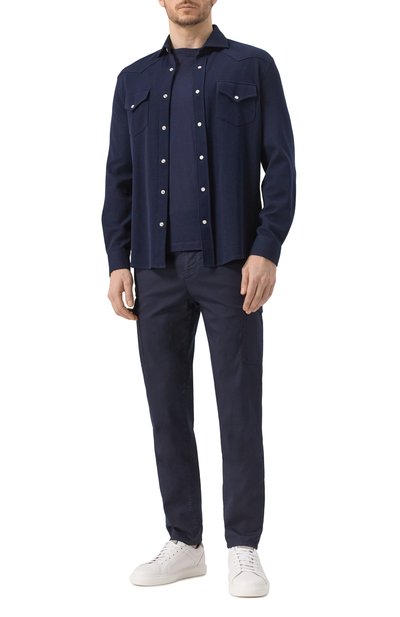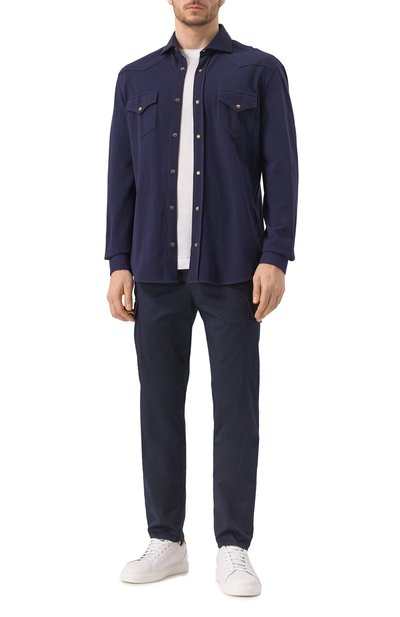 Темно-синяя рубашка сможет заменить тонкую куртку в прохладный день. За сохранение тепла отвечает плотный материал. Д ля пошива модели использовали бархатистый хлопковый микровельвет. Изделие дополнили двумя нагрудными карманами с фигурными клапанами, как у ковбойской одежды.