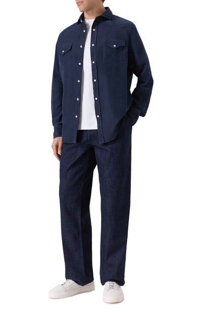Темно-синяя рубашка сможет заменить тонкую куртку в прохладный день. За сохранение тепла отвечает плотный материал. Для пошива модели использовали бархатистый хлопковый микровельвет. Изделие дополнили двумя нагрудными карманами с фигурными клапанами, как у ковбойской одежды.