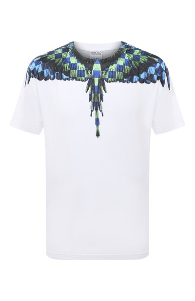 Белый цвет футболки Марсело Бурлон сделал фоном для знакового принта в виде распахнутых крыльев, который обновил, совместив с шахматным узором. Модель с круглым вырезом выполнили из тонкого джерси, для производства которого использовали органический хлопок. При его выращивании не применяли химикаты, разрушающие верхние слои почвы.