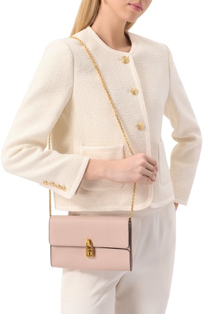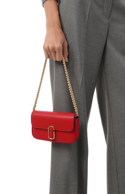 Небольшая сумка J Marc из матовой кожи цвета фуксии дополнена съемным плечевым ремнем из текстиля и золотистой цепочкой, которая легко трансформируется в две ручки. Марк Джейкобс украсил широкий клапан аксессуара крупным двутавровым логотипом бренда. Во внутреннее отделение и карман, застегивающийся молнией, поместятся смартфон, ключи и паспорт. Для кредитных карт предусмотрен карман со слотами.