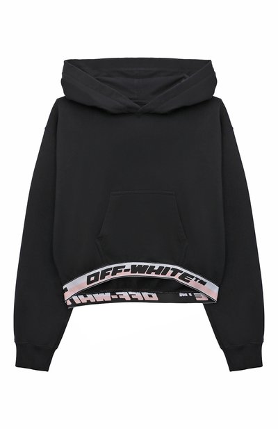 Для изготовления черного худи использовали мягкий хлопковый трикотаж с фактурной изнанкой. Плотный материал поддерживает комфортную для тела температуру, а прямой крой позволяет ребенку свободно двигаться во время прогулки. Жаккардовый брендированный пояс с полосатым неброским узором подчеркивает асимметричный крой низа.