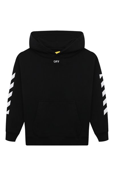 О принадлежности черного худи бренду заявляет белая надпись «Off» спереди и знаковые диагональные полосы в тон, которыми украсили рукава. Для пошива модели с глубоким капюшо ном мастера марки использовали приятный на ощупь хлопковый трикотаж. В сочетании с выверенным кроем такой материал делает вещь максимально комфортной.
