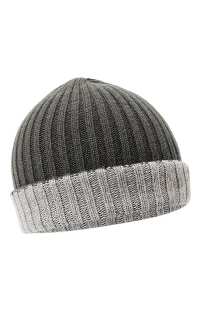 Серую двуслойную шапку бини с широким отворотом, демонстрирующим изнанку, можно носить и более темной стороной наружу. Аксессуар с рифленым эластичным узором связали из тончайшего кашемира. Почти невесомый пух из подшерстка горных коз тщательно вычесали и промыли родниковой водой, сделав модель особенно приятной на ощупь и теплой.