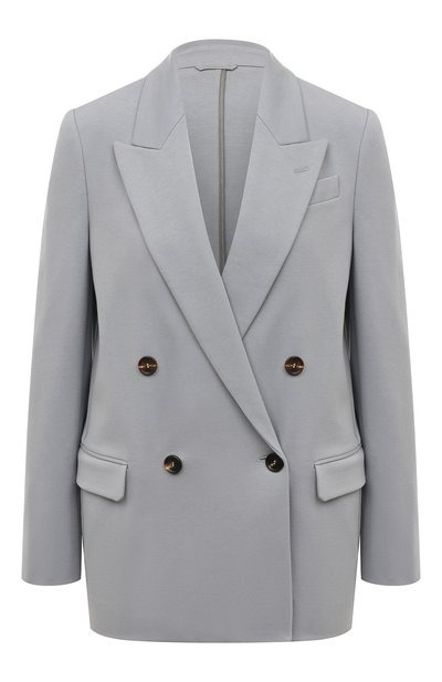 Серый двубортный пиджак делает максимально комфортным материал. Мастера марки, основанной Брунелло Кучинелли, сшили модель из мягкого трикотажа, в котором тонкую шерсть соединили с шелковистой вискозой. Такой блейзер, лишенный подклада, поддерживает оптимальную температуру, идеально садится по фигуре и не сковывает движения. Изделие одинаково удобно носить и поверх блузы, и на голое тело.