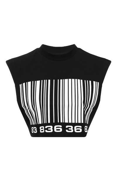 Укороченная черная майка формирует не менее графичную линию верха, чем power jacket. Такой силуэт создают спущенные плечи, как у фирменных футболок, и в меру плотное хлопковое джерси. Пропорции визуально увеличивает гипертрофированный принт в виде фирменного штрихкода, который сзади зеркально отразили.
