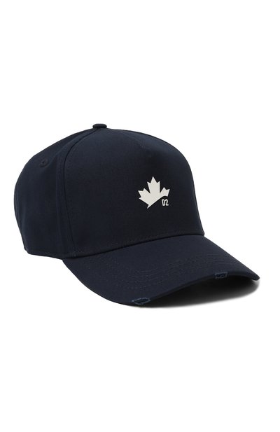 Для пошива темно-синей бейсболки выбрали прочный хлопковый габардин, который не пр одувается ветром. По краю козырька искусно сформировали максимально естественные потертости, спереди тулью украсили белым рисунком, а сзади — логотипом марки.