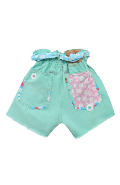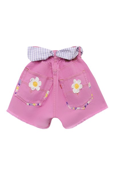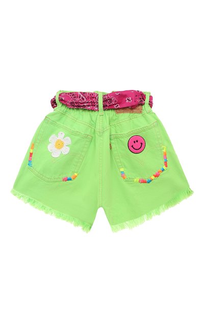 Джинсовым шортам задали летнее настроение с помощью лимонно-желтого оттенка и декора: задние карманы украсили ироничными патчами и радужной вышивкой. Модель с бахромой по краям сшили из мягкого тонкого денима. С голубым логотипом зарифмовали пояс в виде банданы с узором пейсли.