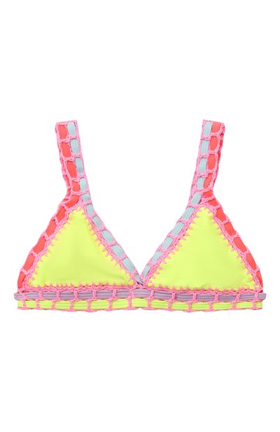Раздельный купальник яркого светло-зеленого оттенка удобно садится по фигуре и не сковывает активных движений. За это отвечает как выверенный крой, так и фактурный эластичный материал на основе прочного нейлона. Лиф украсили розовой пряжкой в форме цветка.