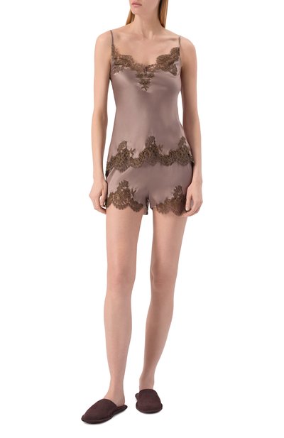 Команда бренда сделала черные пижамные шорты настолько нежными и легкими, насколько это возможно. Модель с низкой посадкой сшили из тончайшего сатина, в котором отборный гладкий шелк соединен с эластаном. Внизу почти невесомая ткань сменяется широкими лентами полупрозрачного сицилийского кружева, сплетенного из длинноволокнистого хлопка.