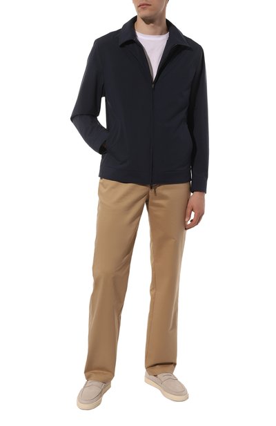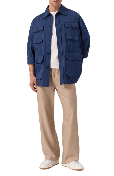 Команда марки раскроила темно-голубую куртку по лекалам рубашки, выбрав для изготовления тонкий и вместе с тем прочный непромокаемый текстиль. Этот материал с плотным переплетением ультратонких волокон не продувается ветром, поэтому в такой модели с отложным воротником и крупным накладным карманом с клапаном будет ко мфортно в непогоду.