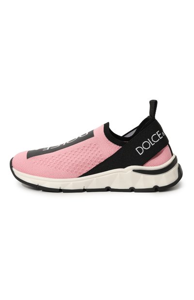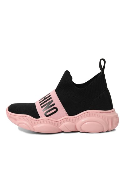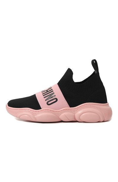 Для пошива черных кроссовок с эластичным верхом выбрали прочный фактурный текстиль, обеспечивающий комфорт для ног. Модель украсили светло-розовой вставкой в тон скульптурной гибкой подошве, амортизирующей при ходьбе. Принадлежность бренду подчеркнули крупным контрастным логотипом.