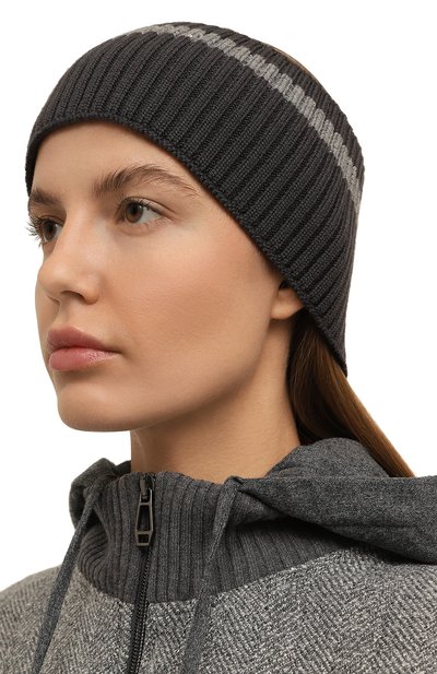 Для изготовления темно-серой шапки бини мастера марки использовали мягкую смесовую пряжу на основе шерсти и кашемира. Благодаря тонким нежным волокнам изделие получилось особенно приятным на ощупь и способным сохранять оптимальный микроклимат. Модель с широким отворотом связали в технике английской резинки, поэтому она плотно облегает голову, но не сдавливает.